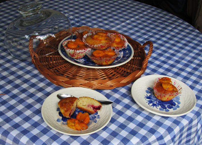 Ponieważ sezon morelowy u nas w pełni upiekłam muffinki z wiśniami i morelami. Pałaszowaliśmy je w altanie. Za tydzień będę już na urlopie wtedy zrobię klosz wintage bo ten szklany nie pasuje mi tu. Pozdrawiam niedzielnie i oby wreszcie pogoda się ustabilizowała bo tych deszczów ja mam serdecznie dość.